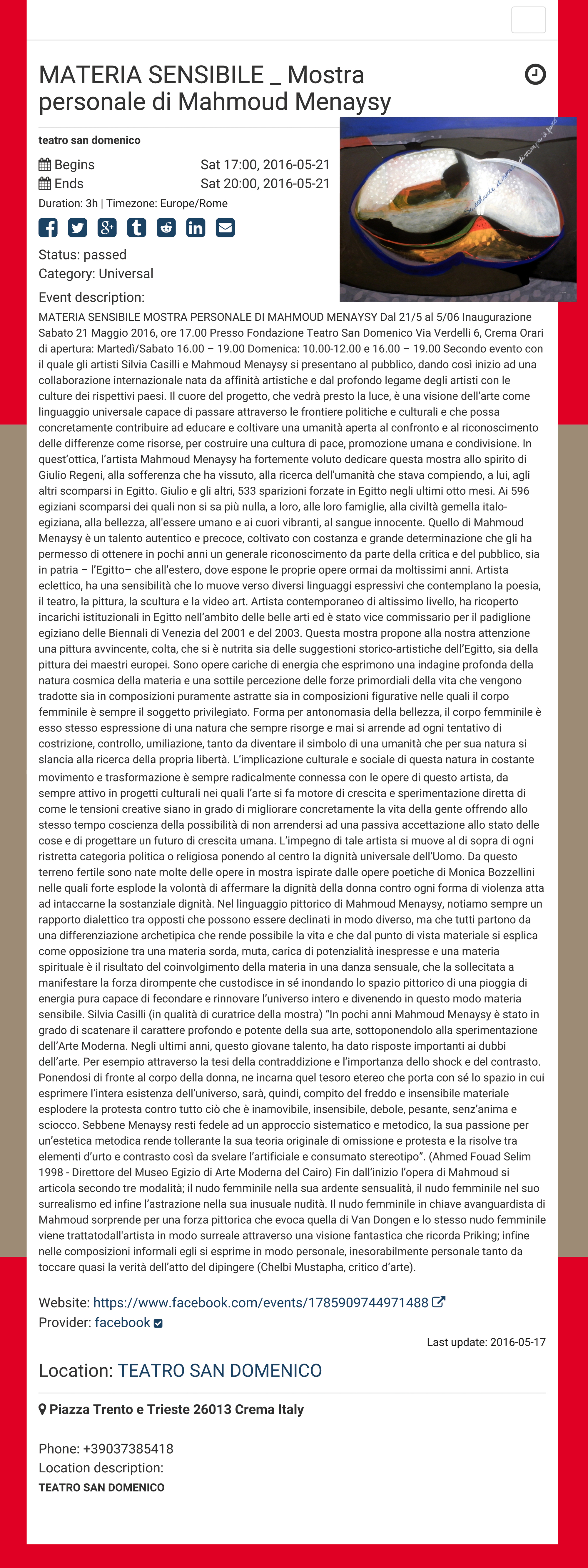 Previous Image Next Image MATERIA SENSIBILE _ Mostra personale di Mahmoud Menaysy @ TEATRO SAN DOMENICO MATERIA SENSIBILE _ Mostra personale di Mahmoud Menaysy @ TEATRO SAN DOMENICO Like Loading...